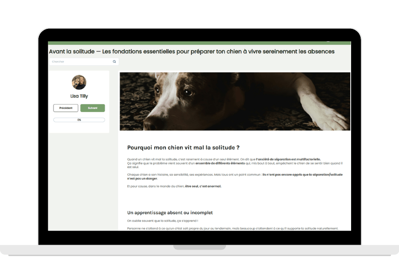J’ai suivi la formation de Lisa (Mission Solitude) il y a maintenant plus de trois mois. À l’époque, j’étais complètement perdue face à l’anxiété de séparation de mon chien et je ne savais plus comment l’aider.